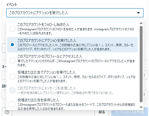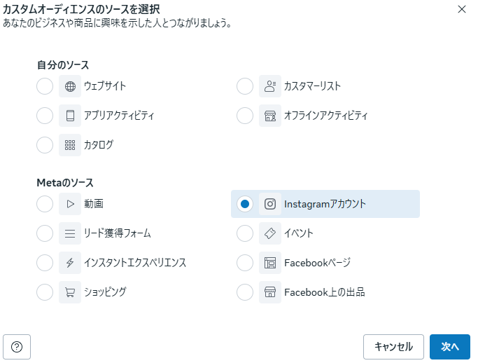 META広告でインスタグラムアカウントのユーザーに対するカスタムオーディエンス作成方法 投稿者:アガルトマーケティング代表-春田- 投稿公開日:2025年10月1日 投稿カテゴリー:FACEBOOK広告 オーディエンス⇒オーディエンス作成⇒カスタムオーディエンス作成 Instagramアカウント⇒次へ プロファイルにアクセスしたユーザーや、フォローしはじめたユーザーなどの条件を設定 これを広告マネージャーでセットすればOK Please Share This Share this content Opens in a new window Opens in a new window Opens in a new window Opens in a new window Opens in a new window Opens in a new window Opens in a new window Opens in a new window Opens in a new window Opens in a new window Opens in a new window アガルトマーケティング代表-春田- 保険会社営業職を経て、SEO専門のWebマーケティング会社に転職。Webサイト制作やコンテンツマーケティング、SEOコンサルティングディレクターを行う。これまでに100社を超えるSEO施策、またコンテンツマーケティングに携わっている。 ▼Webマーケティング保有資格 SEO検定1級 Googleアナリティクス個人認定資格 その他Google公認資格多数保持 おすすめ FACEBOOK広告のGTMでのピクセル設置&イベント設定方法 2023年4月27日 FACEBOOK広告個人アカウントの権限共有方法を画像で紹介 2023年4月20日 FACEBOOK広告のイベント発火確認方法(イベントテストツール&Meta Pixel Helper) 2023年4月27日